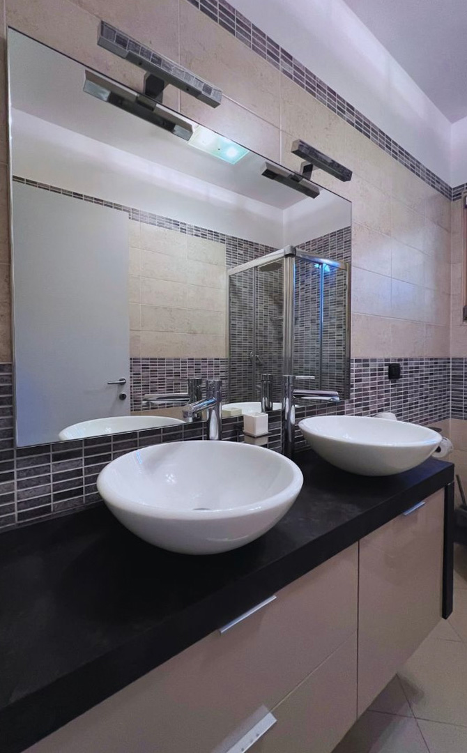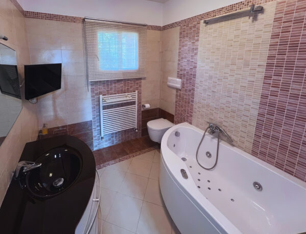 Villa di testa indipendente, con giardino privato, ampio salone con cucina, 3 camere da letto e 2 bagni di cui uno con vasca idromassaggio doppia e tv. 8 posti letto totali.